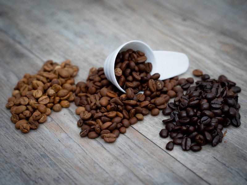 Infatti nell’immagine vediamo subito il primo gruppo a sinistra, con i chicchi a tostatura chiara, nel centro quella media e sulla destra quella scura.