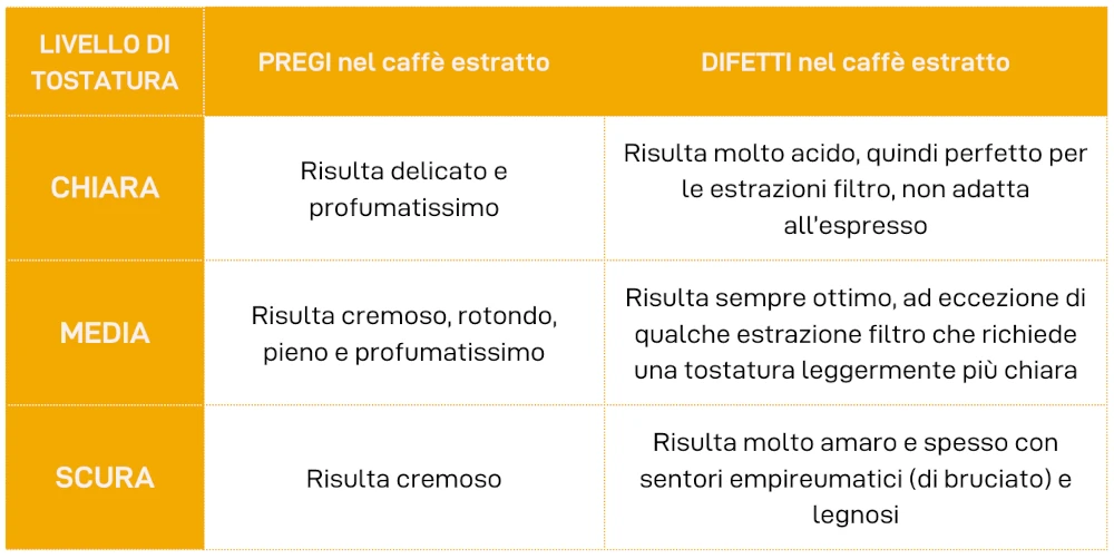 Leggendo la tabella quindi si capisce subito al volo che la tostatura Media dona il perfetto equilibrio tra gusto e aromi, crema e corpo e adattabilità ai diversi metodi di estrazione.